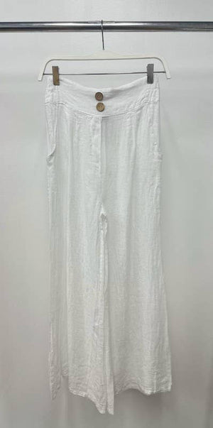 LINEN WIDE LEG PANTS WITH 2-BUTTON FRONT DETAIL Swing into style with our breezy linen wide leg pants! These airy beauties come with a chic 2-button front that adds just the right pop of personality. The roomy wide leg design keeps you comfy while turning heads wherever you strut. Crafted from soft, breathable linen that's perfect for fashion lovers who refuse to sacrifice comfort for style. Time to give your wardrobe the upgrade it's been begging for!