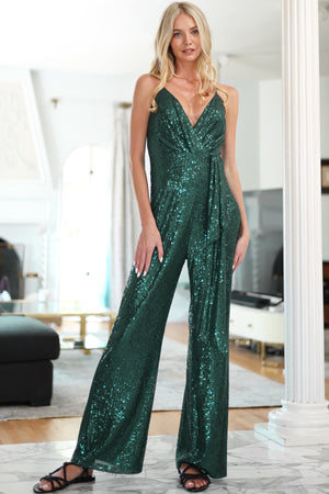 Effortlessly stand out in this emerald sequin jumpsuit. Designed with a surplice neckline and adjustable straps, it offers a flattering fit for any body type. Its tie front detail adds a touch of sophistication, making it the perfect choice for any special occasion.