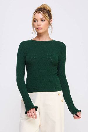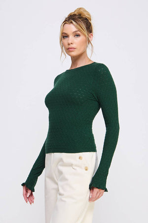Fine gauge pointelle knit top with ruffle sleeve detail. Body size: contemporary Pattern: solid Length: long-sleeve Style: ruffle Fabric: viscose.