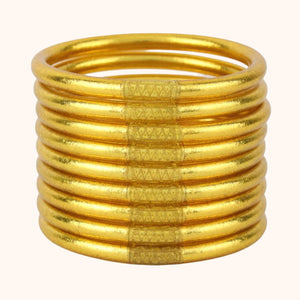 BuDhaGirl Gold All Weather Bangles® (AWB®), are the epitome of luxury in BuDhaGirl's impressive lifestyle collection. Our remarkable bangles redefine elegance with their weightless, soundless, waterproof, and TSA-proof design. Crafted to perfection, each set comprises nine bangles, symbolizing intentions for the day. Wear them anywhere, as their soundless and waterproof nature ensures seamless integration into any setting.