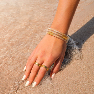 Mindful Glamour Ritual: Pause. Breathe. Slip on your Three Sands AWB® and feel the grounding embrace of the earth. With each bangle, set an intention for presence, balance, and gratitude, carrying the essence of stillness and grace throughout your day.