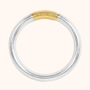 Handcrafted in Thailand by exceptionally skilled artisans, each Tzubbie Silver All Weather Bangle is meticulously crafted by a team of 20+ artisans, making each bangle a labor of love. Utilizing organic materials, slight color variations may naturally occur due to humidity and temperature conditions. Over time, the uncoated brass of our Serenity Prayer Bead may develop a verdigris patina, adding to its charm. The essence of the Tzubbie Silver All Weather Bangle lies in its ability to age gracefully, acquiring character while retaining its inherent beauty—much like the remarkable women who wear them.