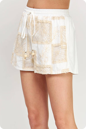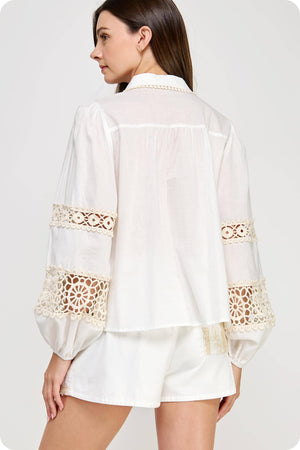 2 piece long sleeve button down shirt and shorts crochet macrame lace set in Viscose woven fabric. The shirt blouse features button down closure, spread collar, lining, long sleeve with elasticated cuff, and beautiful lace and crochet broderie patchwork. The shorts feature elasticated waist, adjustable drawstring tie with shell decoration, lining, one back pocket detail, and beautiful lace and crochet broderie patchwork.