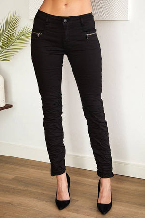 INTRODUCING OUR ZIPPERED POCKET MOTTO CRINKLE DENIM PANTS - THE PERFECT BLEND OF FASHION AND FUNCTION. THE ZIPPERED POCKET PROVIDES ADDED SECURITY FOR YOUR BELONGINGS, WHILE THE CRINKLE DENIM ADDS A UNIQUE AND STYLISH TEXTURE. GET THE BEST OF BOTH WORLDS WITH THESE VERSATILE PANTS.