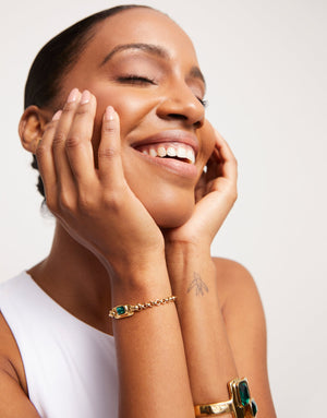 18K gold-plated chain bracelet with central faceted green crystal. Made in Spain with a 100% handmade process.These pieces of jewelry are an art exhibition composed of bracelets, rings, necklaces and earrings, where each piece is a work of art in which we find emerald style cut crystals and pieces with layers of geometric shapes. Discover the collection ser magnética.