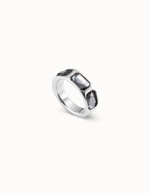 Make a bold statement with this handcrafted UNODE5O ring from Spain, featuring three faceted dark gray crystals set in sterling silver plating. Its edgy design and striking color contrast add a daring touch to any outfit, perfect for those who want to stand out with confidence and style.