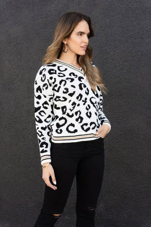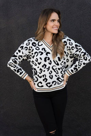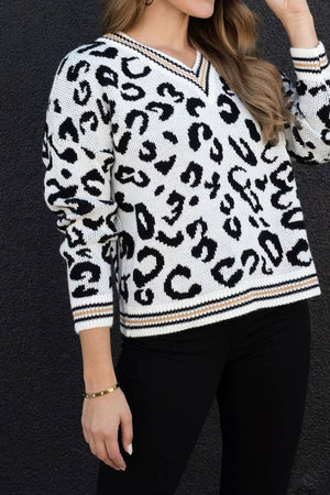 LEOPARD PRINT CROCHET V-NECK SWEATER THIS V-NECK SWEATER FEATURES A STYLISH AND TRENDY LEOPARD PRINT DESIGN, PERFECT FOR ADDING A POP OF PATTERN TO YOUR WARDROBE. THE CROCHET DETAILING ADDS A UNIQUE TOUCH TO THIS CLASSIC SILHOUETTE. STAY COZY AND CHIC IN THIS VERSATILE PIECE.