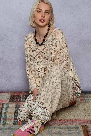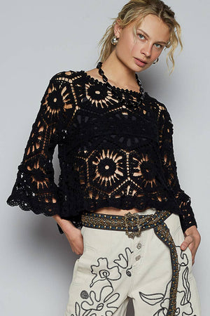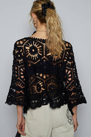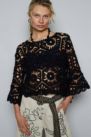 This playful cropped top features a round neckline and 3/4 sleeves, crafted with charming crochet showcasing a mix of knit patterns. For detailed specs and sizing, just give our team a shout!