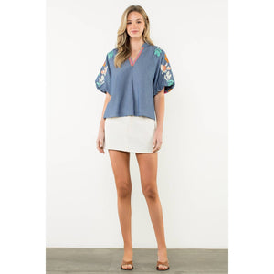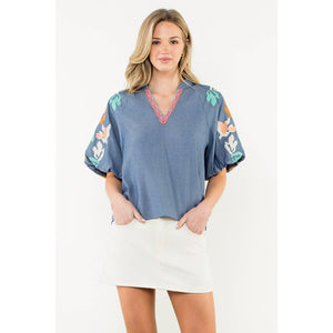 The Embroidered Puff Sleeve V-Neck Top combines delicate embroidery with a flattering puff sleeve design for a stylish, comfortable fit. Crafted from a soft woven fabric blend of 70% cotton and 30% rayon, it offers breathability and ease of movement. Designed in the USA, this top features a 23-inch body length and a 39-inch bust width in size S, making it a versatile addition to your wardrobe. Available in a prepack with sizes XS to XL, it suits a range of body types while providing a charming, feminine silhouette.
