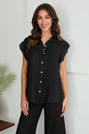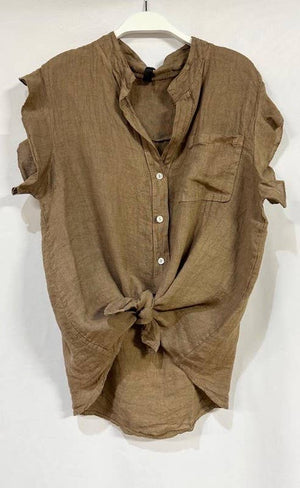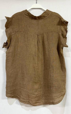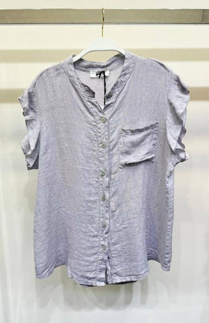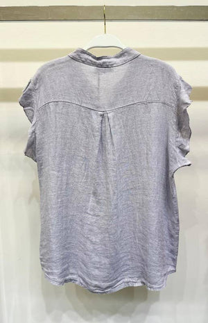 This charming Italian linen top features a solid band collar, playful ruffle sleeves, and a handy chest pocket. Lightweight and breathable, it’s perfect for sunny days. The button-down front adds easy style, making this piece a fun and timeless favorite for your wardrobe.