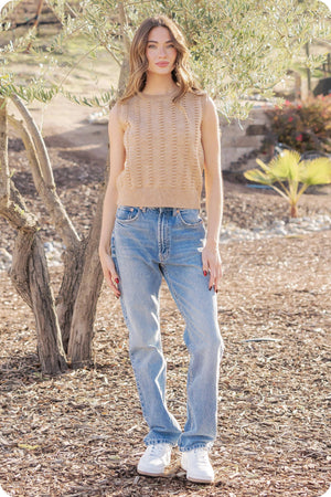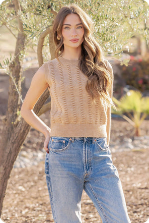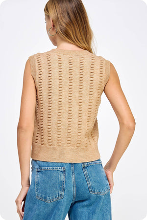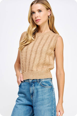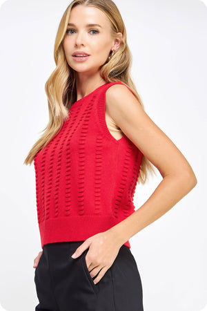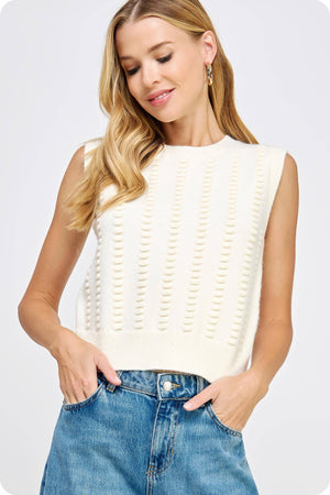 Sweater vest top in textured knitted fabric. This sleeveless sweater top features ribbed armhole/hem/neck, round neck, and textured dotted bodice.